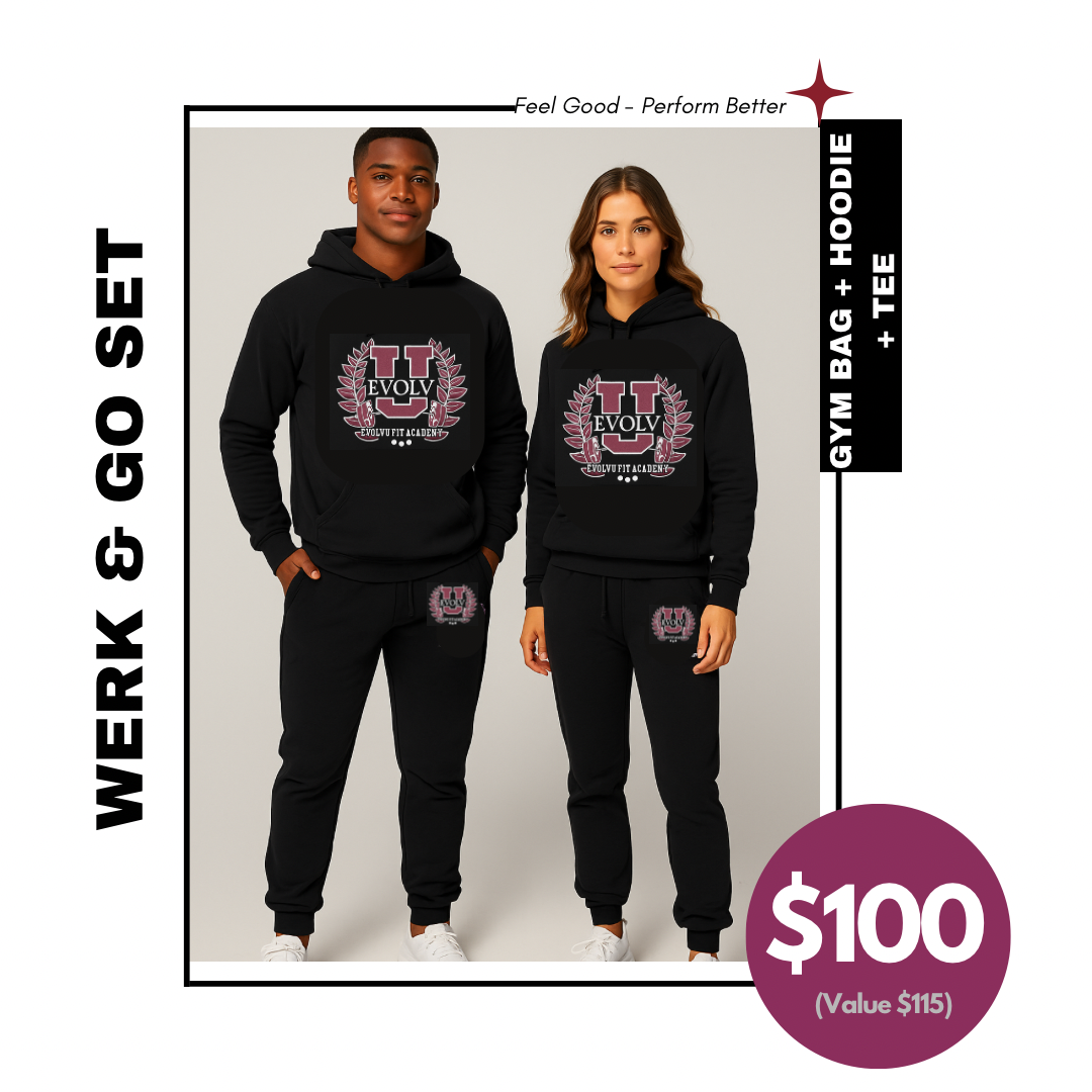 The Werk & Go Set keeps you ready for anything with our durable duffle bag, signature hoodie, and versatile tee. It’s the ultimate grab-and-go combo for those who live the EvolvU lifestyle: committed, consistent, and unstoppable.